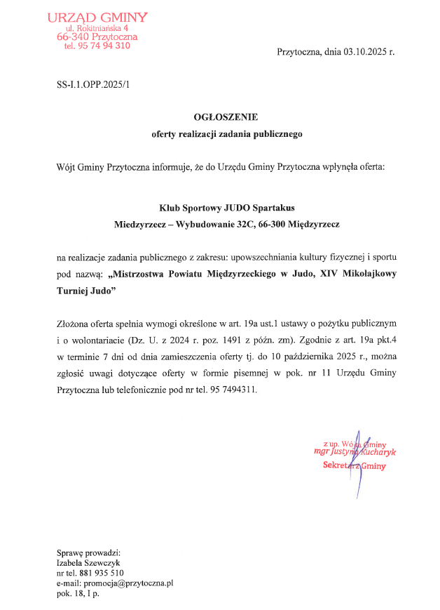 Ogłoszenie-oferta realizacji zadania publicznego: "Mistrzostwa Powiatu Międzyrzeckiego w Judo, XIV Mikołajkowy Turniej Judo"